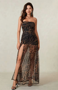 Laissez parler votre instinct avec la robe "Nuit d'été". Audacieuse et élégante, elle célèbre la puissance féminine dans toute sa splendeur. Son motif animalier noir et brun évoque la chaleur de la savane, tandis que sa coupe bustier et sa fente haute soulignent la silhouette avec une sensualité assumée.