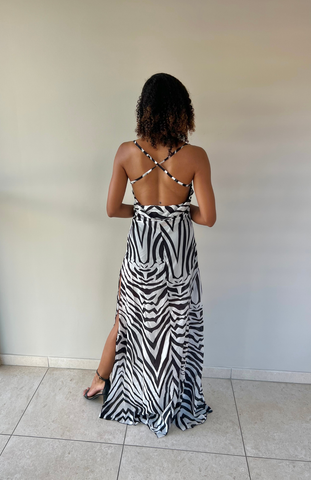 Plongez dans l'élégance sauvage avec la robe Sérénité Zèbre de Tyb Orchid — une pièce fluide et aérienne, sublimée par un imprimé zébré audacieux. Sa fente latérale dévoile la jambe avec grâce, tandis que le tissu légèrement transparent caresse la peau à la lumière.