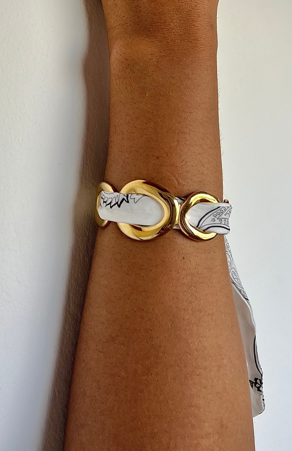 Ce bracelet Tyb Orchid en acier inoxydable doré se distingue par ses anneaux permettant de passer un foulard, créant un bijou unique et personnalisable.